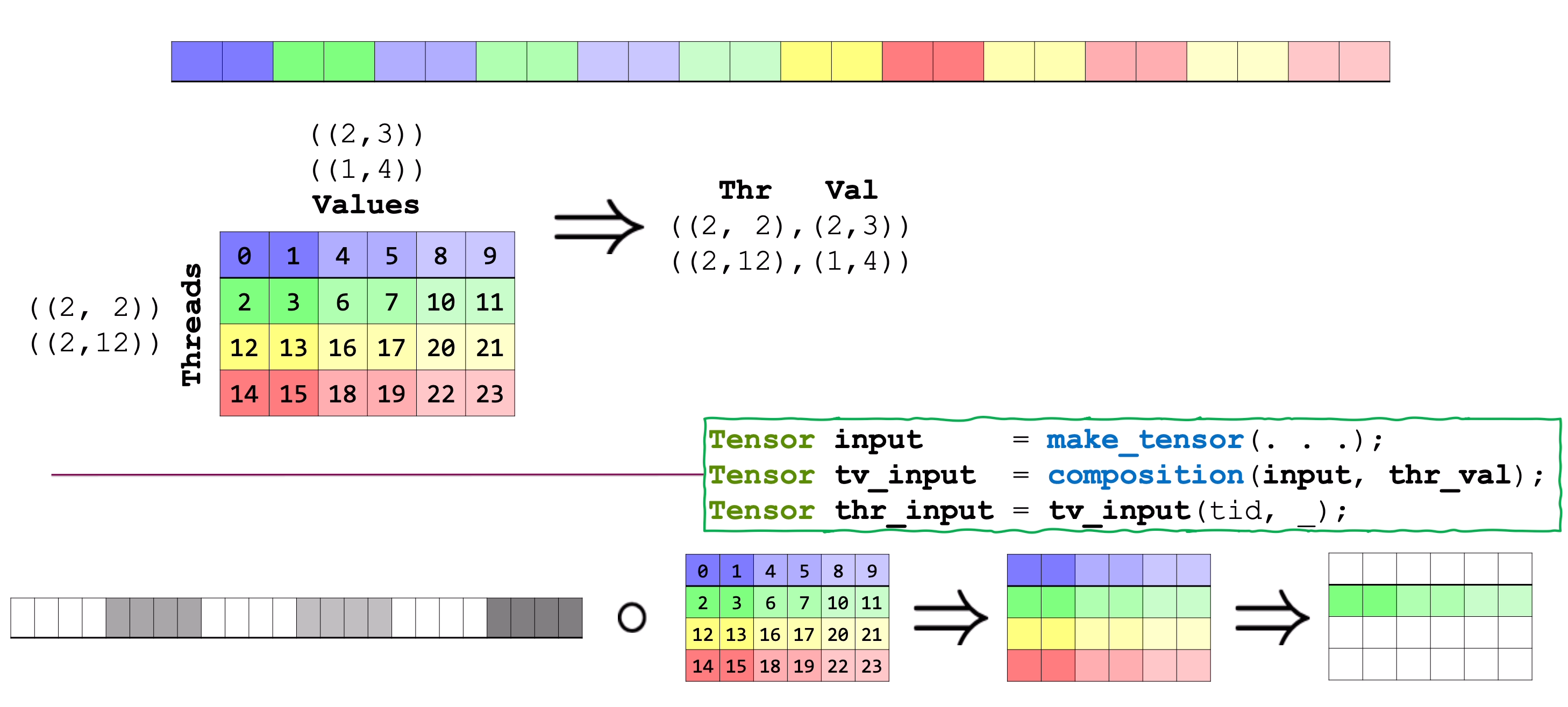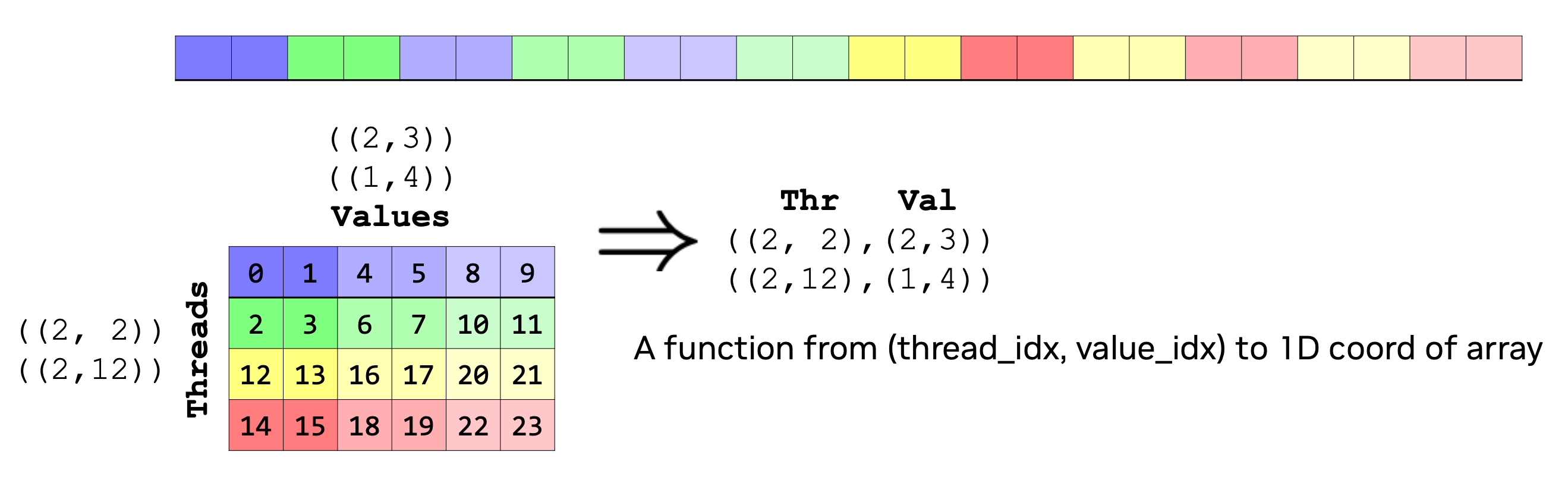 更一般的,对于任意的内存数据,我都可以用这样的thread value layout来描述线程和一维的数据坐标怎么映射,实际上就是layout的composition而已。 这样做的好处是,线程要去读数据的时候直接从这个layout和真实数据composition之后的tensor中slice就可以了,也就是取第几个线程进行slice,得到这个线程对应的真实的数据坐标。